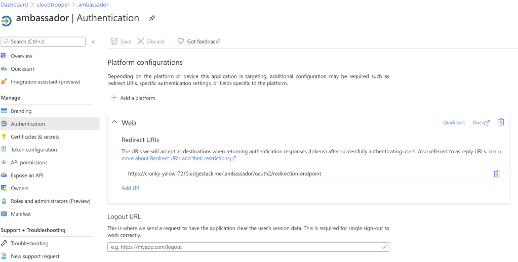 As you can see, it is Ambassador’s FQDN for HTTPS (AAD requires SSL) with the “.ambassador/oauth2/redirection-endpoint” path. You can change further configuration such as adding claims in the “Token configuration” section, or manually define which users and groups can authenticate, but we will go with the defaults. Now we need to teach Ambassador how to use our app, for which you will need three pieces of information: