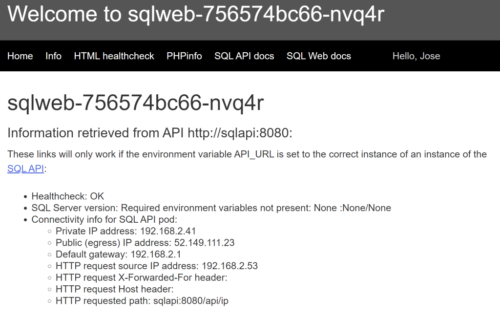 kubectl -n $ns_name run sqlweb --image=erjosito/whoami:0.1 --replicas=1 --env="API_URL=http://sqlapi:8080" --port=80