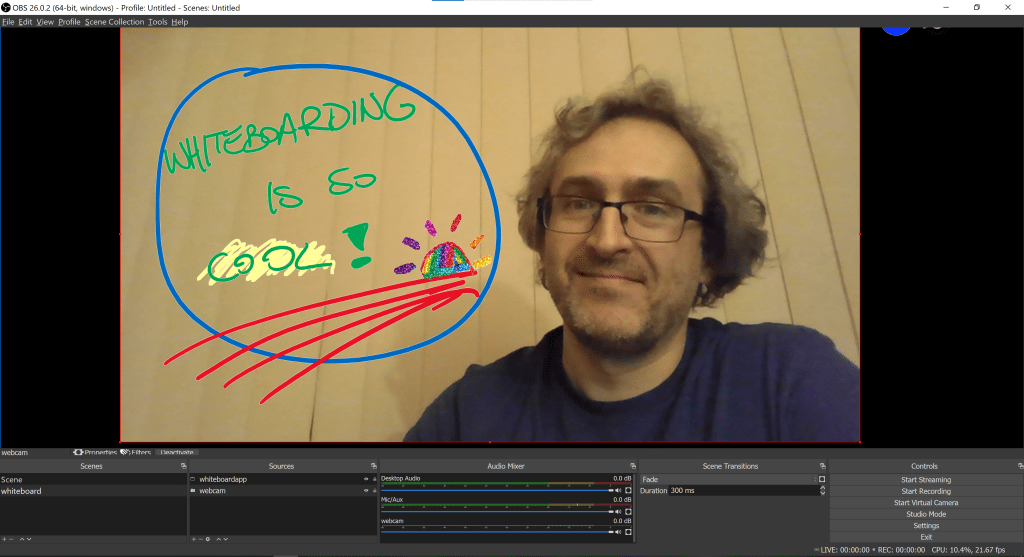 Now create a new whiteboard and paint something, whatever you draw will be super-imposed on your video image. One last note: do not use the black, since for some reason black is just treated like white by the Chroma Key filter if the key color is white, and it does not show on screen. However, other colors will show just fine: