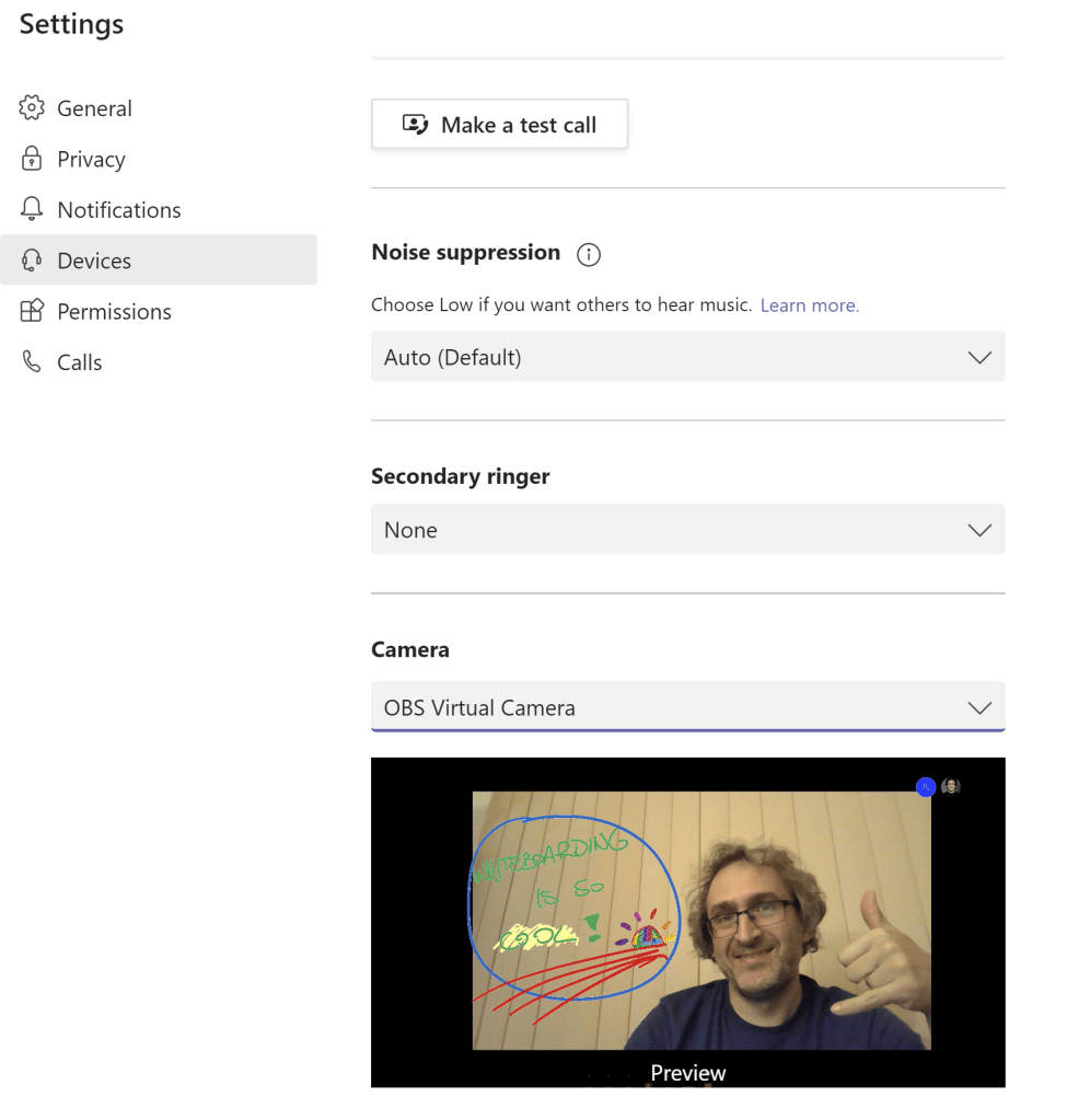 So now we have what we want. In the Controls menu (bottom right of the OBS window) start the virtual camera. This will start a virtual device that is recognized by the OS as a camera. You might need to restart Teams to recognize this new device. When it does, it should appear in the list of available cameras: