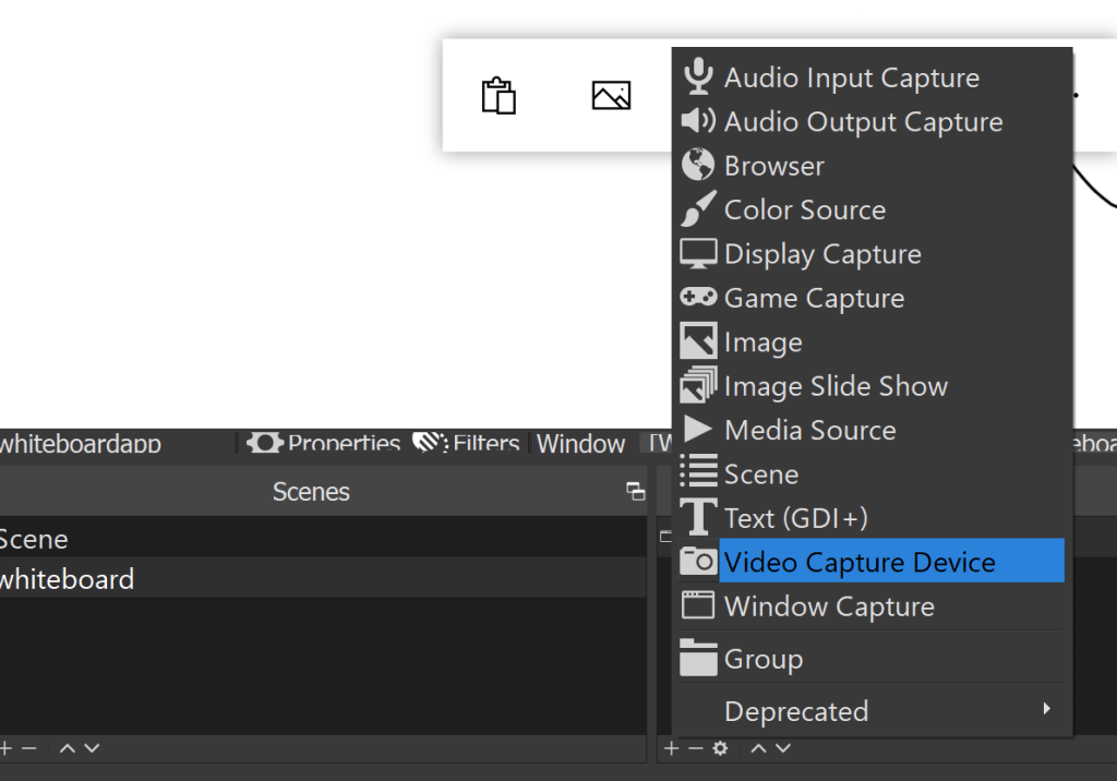 Now we will add our first souce to the scene: your whiteboard. Click the plus sign below the source list, and add a “Window Capture”: