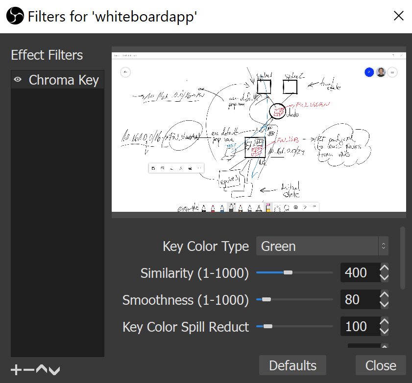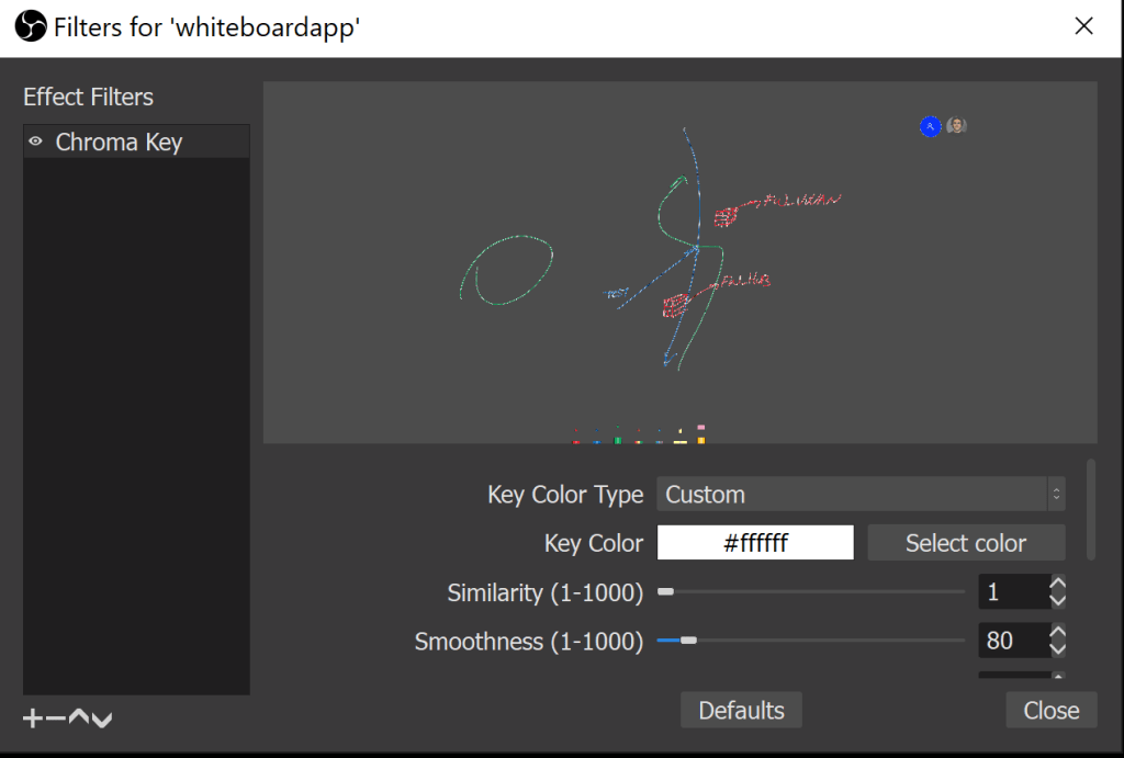 Now your webcam image disappeared, because the whiteboard is not transparent (yet). Let us make it so: In the contextual menu for the whiteboard source, that you can access by right-clicking on its name, choose “Filters”. In the Filters window add a “Chroma Key” filter: