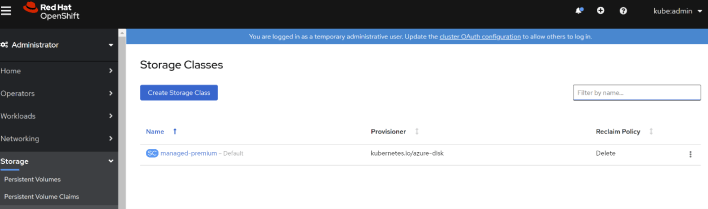 Storage classes are a Kubernetes concept that is used so that Kubernetes can dynamically create the storage required by applications. The configuration of each storage class will determine the properties of the storage resource created in Azure, such as its geo-replication settings or its performance tier. Azure Red Hat Openshift is created with a default storage class that will provision Azure Premium Disks when used to create a Persistent Volume Claim: