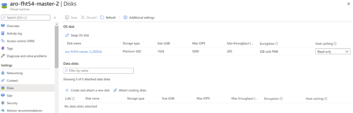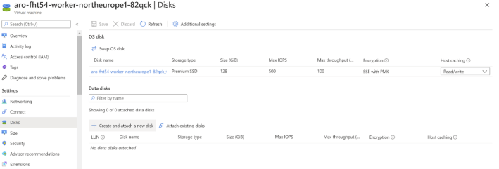 Another difference in the I/O configuration of masters and workers is in the caching mode for the OS disk. As you can see in the previous screenshots, master node disks are configured with read-only caching. This is done so to prevent data corruption in case a problem happened before fully completing a write operation in the Openshift control plane, which could potentially render the cluster unusable. In this case the ARO configuration favors stability at the cost of a slightly higher latency for write operations. The worker OS disks are configured for read/write caching, which will give a higher performance by using the ephemeral SSD local to each Azure host as a cache for both reads and writes.