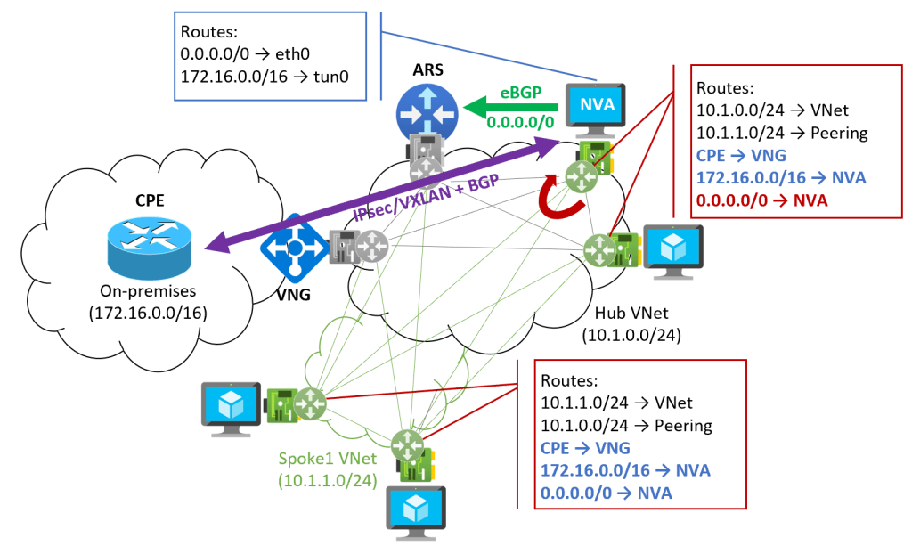 Note that the spoke VMs now learn the on-premises prefix 172.16.0.0/16 from the NVA, and not from the VNG. The only prefix that needs to be learnt over the VNG is the actual IP address of the CPE, so that the overlay tunnel can be established between the CPE and the NVA. Of course, for redundancy reason you would probably have more than one CPE and NVA, and consequently more than one tunnel.