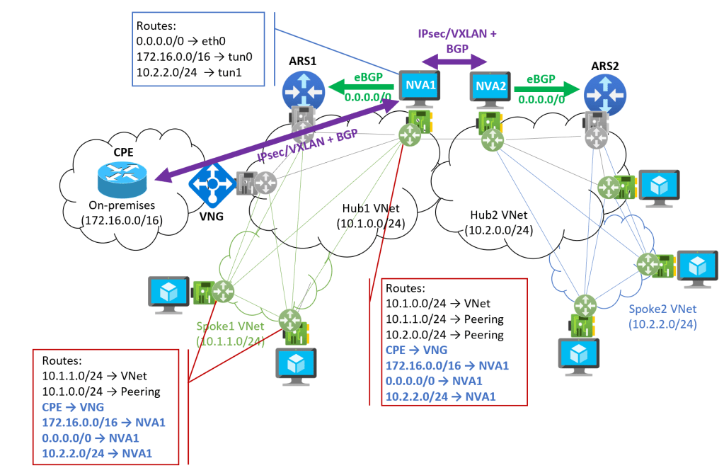 Thank you for such a great article !! I’ve got a question regarding the VPN tunnels on the NVAs. Are they just meant for BGP traffic or also data traffic ? I’m a bit struggling to implement a multiregion scenario with a pair of NVAs on each regions + an ARS. Hub vnets linked with a global peering. The NVA to NVA tunnel is my pain point actually and I would like some clarifications about it.