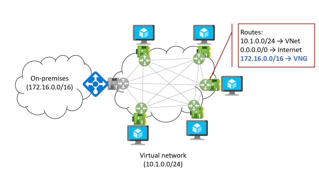 The VNG injects into the effective routes of each NIC the corresponding information, so that each VM knows how to get to the on-premises network, so the effective route table of every NIC in the VNet is now increased with one route.
