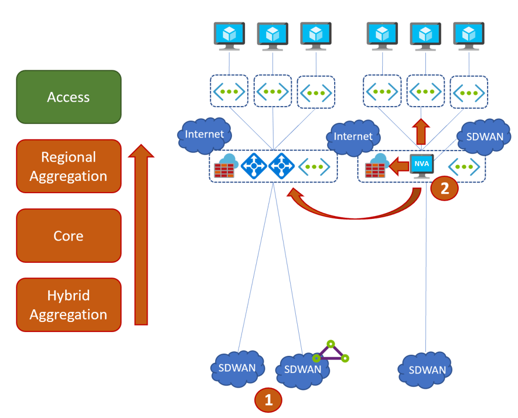 As a describe in this post, the 3-tier design with Virtual WAN and a regional aggregation layer is the most flexible option, so let’s start with this. There are two primary places where you could insert your SDWAN devices: either in the “hybrid aggregation” layer (options 1 and 2 in the diagram below), or in the “regional aggregation” layer (option 3 in the diagram below):