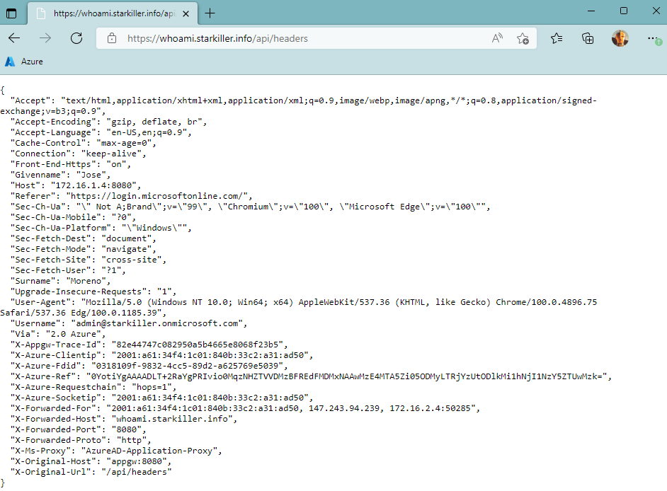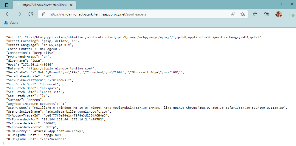 As you can see, headers like Givenname, Surname and Userprincipalname have been introduced by AAD App Proxy with information relative to the authenticated user. Other headers like X-Appgw-Trace-Id and X-Forwarded-Port have been introduced by the App Gateway.