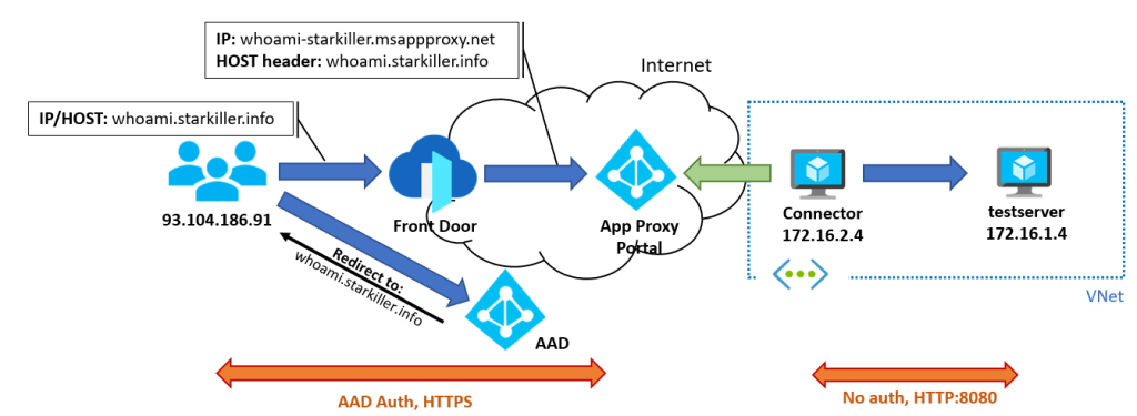 Note the design is now more complex, because Front Door is sitting between the user and the AAD Proxy Portal that provides authentication. For this authentication to work, the redirection URL that Azure Active Directory will provide to the user after successful authentication needs to send them back to Front Door and not to the App Proxy portal, otherwise authentication would break.