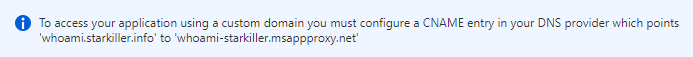 Without going into too much detail, the solution to this is using your own custom domain (in my case I bought starkiller.info for a couple of bucks) and your own digital certificates (which I generated from Let’s Encrypt and uploaded to my Azure Key Vault using this method). This way you can define that your application is behind a custom domain name (whoami.starkiller.info), but in your DNS you resolve this FQDN to Front Door via a CNAME record.