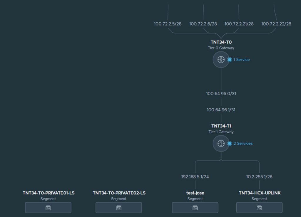 Let’s go back to Azure. If you remember, the Megaport ExpressRoute circuit was connected via Global Reach to BGP neighbors 10.2.252.129 and 10.2.252.130 on ASN 12076. In AVS we can have a look first at the network topology in NSX Manager: