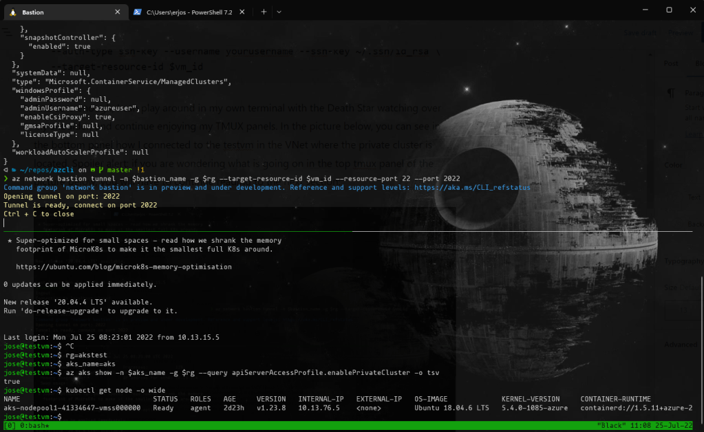 And sure enough, I can still use my own terminal with my tabs, the fonts I love (Mononoki if you are wondering), my TMUX panels, and the Death Star watching over my shoulder. In the picture below, you can see in the bottom panel how I connected to the test VM in the VNet where the private cluster is located: