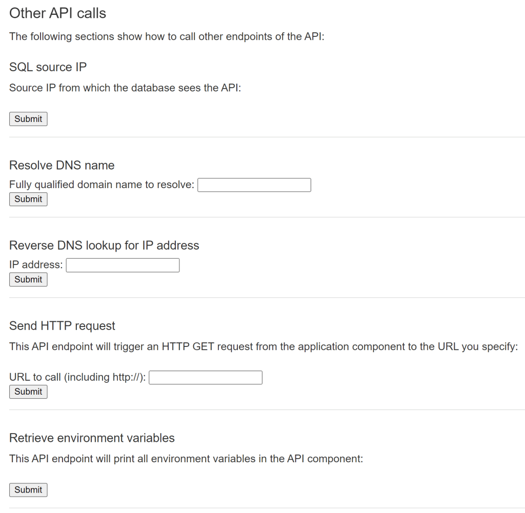 The heart of the app is the application tier, that offers a lot of API endpoints to try different things in the infrastructure where you roll it out (see the README file for the whole list):