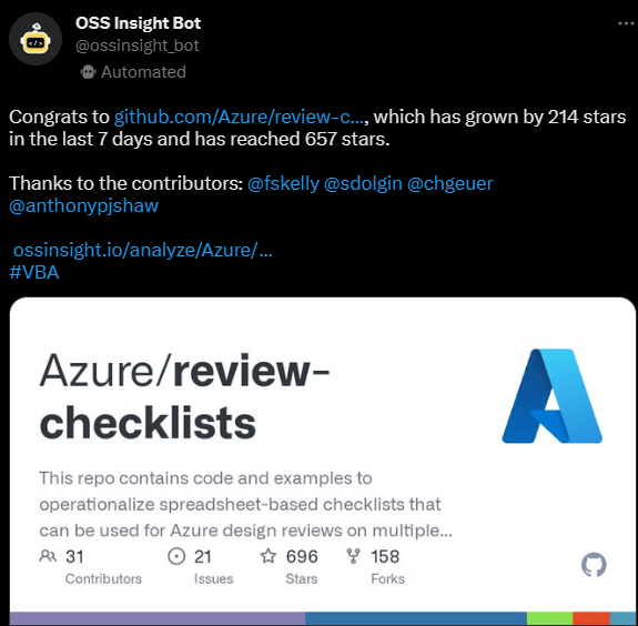 You might have read some previous posts where I describe the work that the FastTrack for Azure team (where I work) has done in the Azure Review Checklists repo. Essentially, it is a collection of the best practices and recommendations that we discuss with organizations when we review their Azure designs and implementations. There you can find best-practice checklists for Azure Landing Zones, Azure Kubernetes Service, Azure Virtual Desktop, API Management and many more. This repo has been getting quite some traction lately: for example, we were so happy to see this tweet: