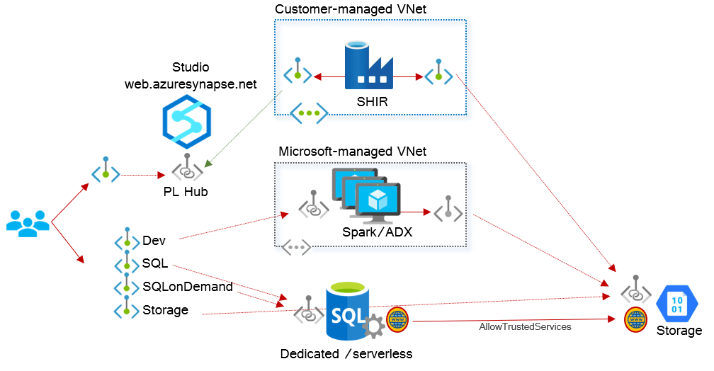 • Dedicated or serverless pools will connect to Azure Storage using public IP addresses, and communication will be secured using managed identities ( “allow trusted services”).