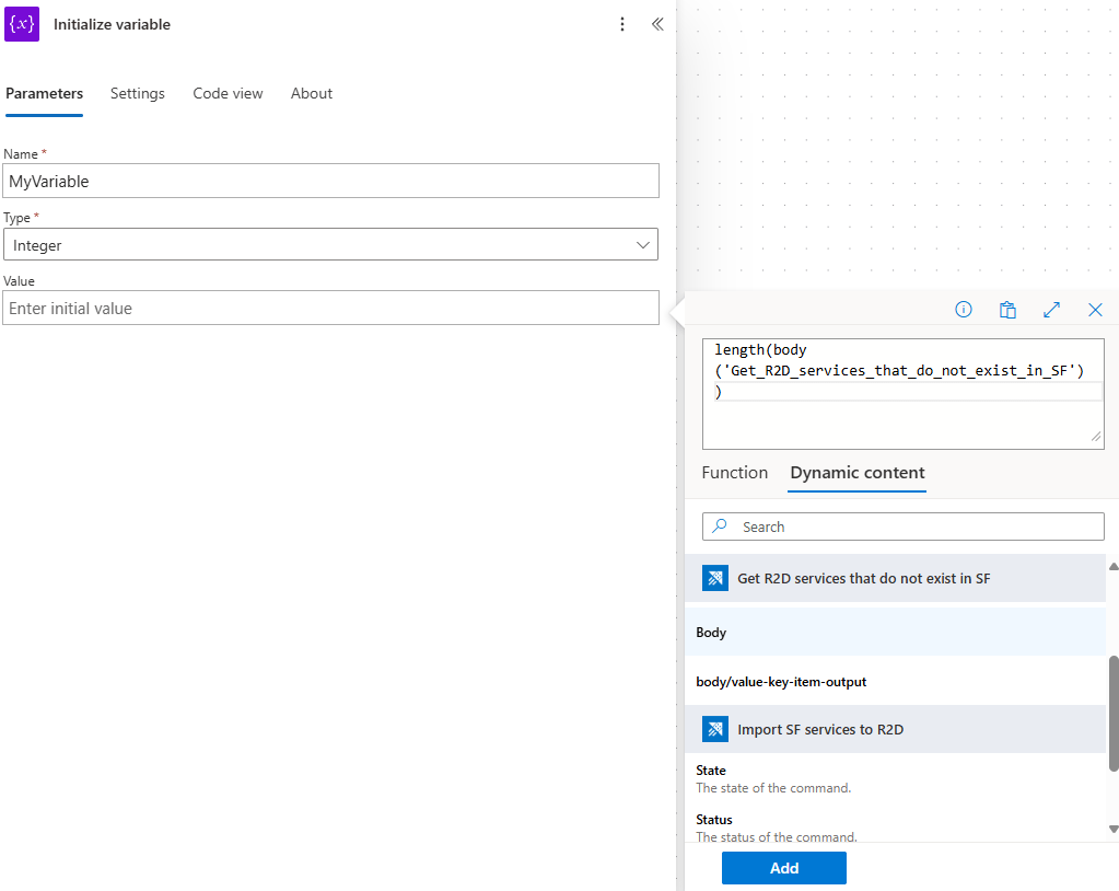 Now you only need to click the “Add” button. There you go, if you followed me so far you already know the most important concept: how to access previous results of an action sending a KQL query to an ADX cluster. This is what the code of the variable initialization looks like: