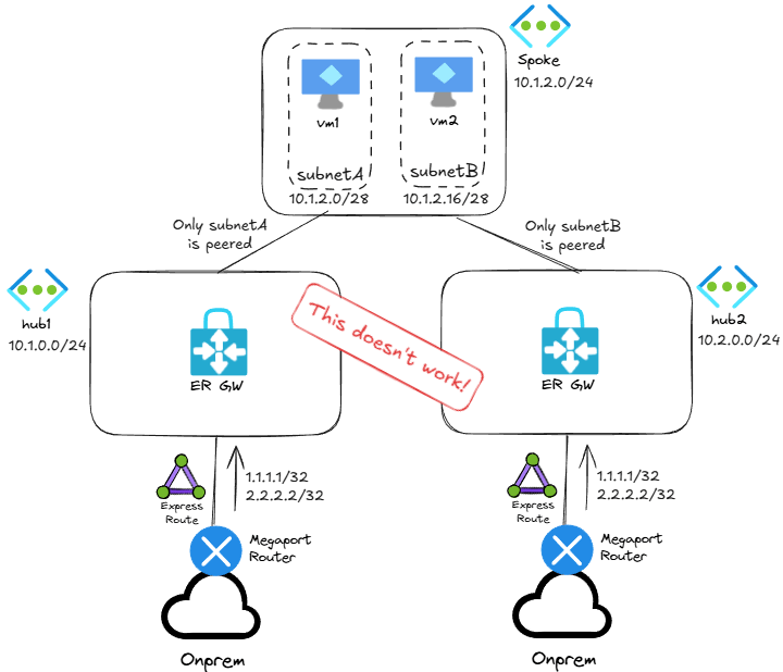 So if instead of peering the whole spoke VNet you only peer one of the spoke subnets, what happens? Let’s start with ExpressRoute: as you might have expected, now the VNet space is not advertised, but instead the individual subnets. In this case, only the first subnet 10.1.2.0/28 gets advertised, and the spoke VNet space (10.1.2.0/24) is not there any more:
