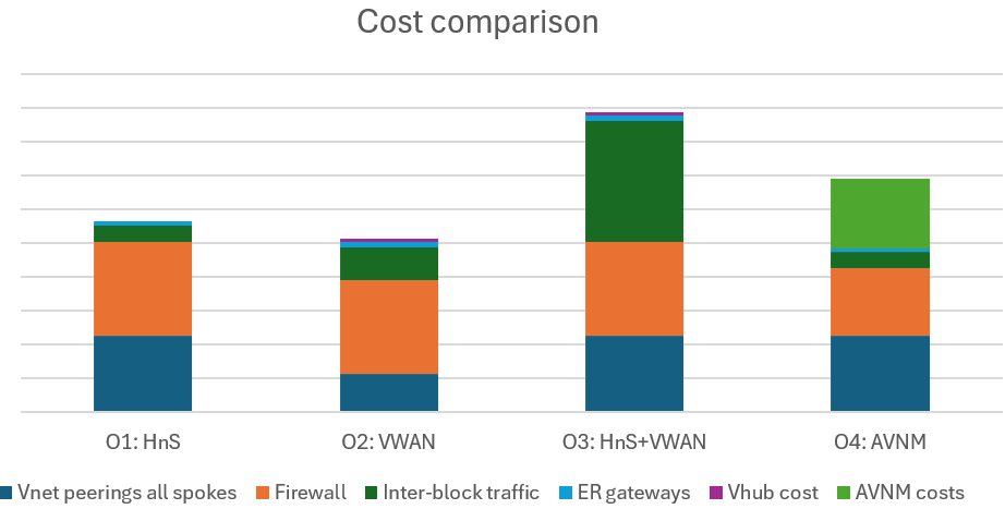 - Options 1 (hub and spoke) and 4 (AVNM) have the same structure, where you pay for traffic traversing the peerings between the hubs. These peerings can be local or global, so you need to differentiate between intra-region and cross-region. AVNM has less intra-region traffic between blocks, because the blocks are larger, but exactly the same cross-region traffic.