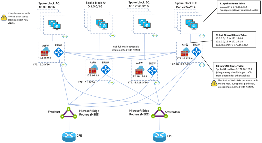 The first one is the traditional customer-managed hub-and-spoke environment, where you connect all of the hubs together via (global) VNet peering. The maximum number of spokes per environment is 400, which is the number of routes you can have in the route table associated to the GatewaySubnet:
