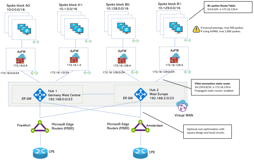 The initial question is simple enough: which Azure networking architecture is best for around 3,000 VNets over two regions with Azure Firewall and ExpressRoute? Different options exist for large-scale hub-and-spoke environments, don’t miss Adam Stuart’s blog on that topic. Out of those, I selected four options as the most attractive.