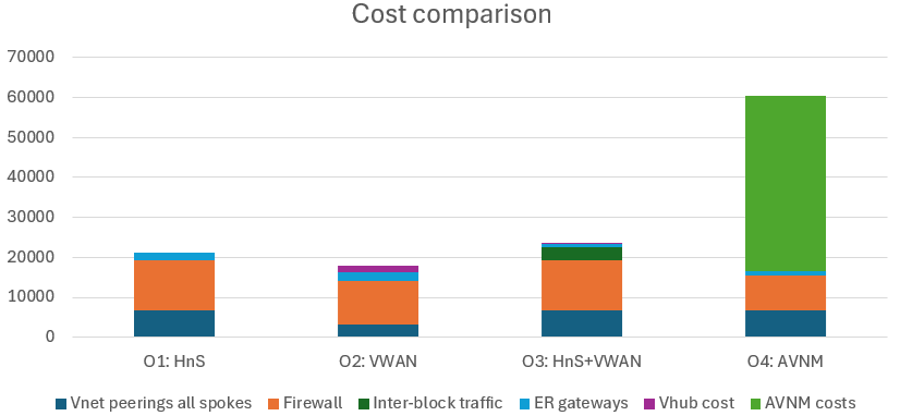 - The firewall costs are roughly the same in all options, slightly less for AVNM (due to the larger blocks and to the mesh between the spokes).